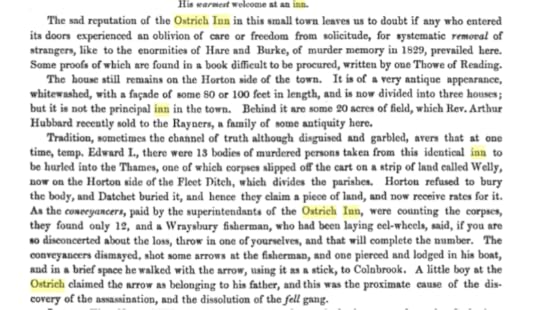 The Ostrich Inn, ColnbrookIn a book written by Thowe of Reading, and quoted by Lipscomb in Lipscomb, Hist. and Antiq. of Bucks. iv, (London: 1632) p. 431, there is a description of the murder of 13 people by the landlord of the Ostrich Inn and his associates and the circumstances which led to their apprehension. There is an extract from Lipscombe in History of the parish of Wraysbury, Ankerwycke Priory and Magna Charta Island ; with the history of Horton and the town of Colnbrook, Bucks / by Gordon Willoughby James Gyll. (1862).