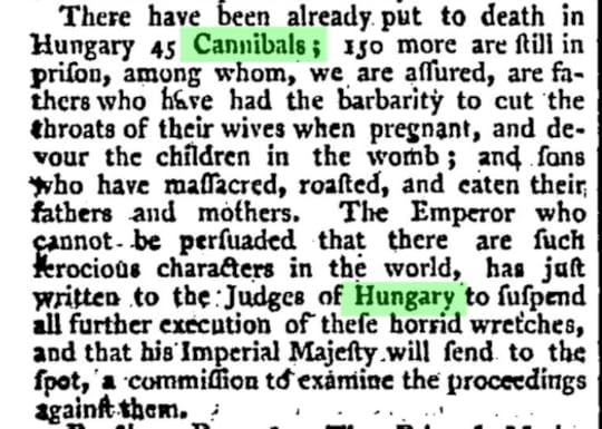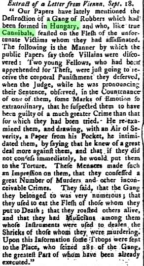 [Note the British reports don’t mention ethnicity of the gang, but an article that came out in The County magazine Nov. 1787 which claimed they were Roma, or that this was the claim of German newspapers, and that in Hungary there was already a presumption that the Roma were cannibals. That article also claims around 100 people were executed for cannibalism in 1782-83 but we also know Joseph II ordered a stay of executions when they got to 45, while 100+ were still imprisoned, so I’m not sure if this is the case or a misunderstanding/inflated figures.