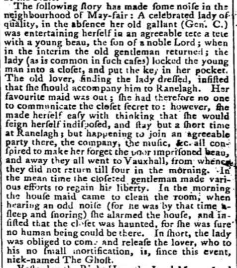 This story was circulating in various newspapers that autumn; the month before (September 1782) it was carried by Parker’s General Advertiser and Morning Intelligencer (London), 30 Sept 1782, Issue 1850, but I found it in the Reading Mercury first and liked the drop cap it used, so that’s the screengrab I’ve shared!