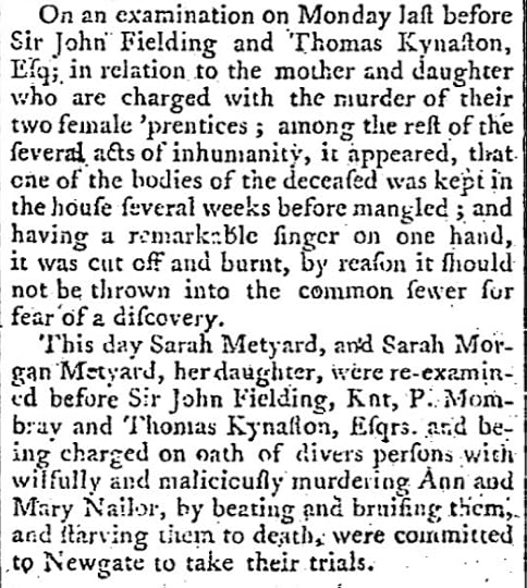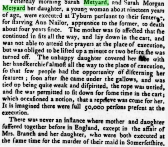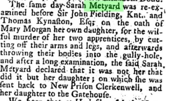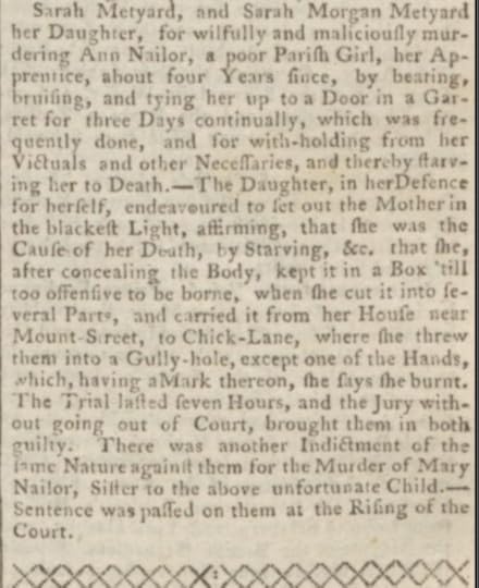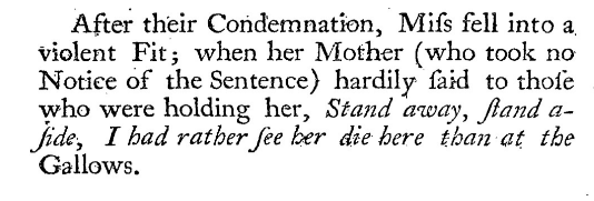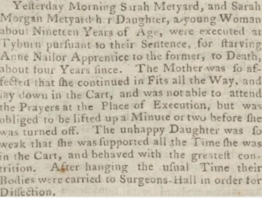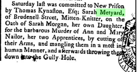 Having discovered the case due to a throwaway line at the end of a report on the murderous mitten-knitter, Sarah Metyard, and her daughter Sarah Morgan Metyard, I decided to look for the case of Mrs and Miss Branch. It’s not in any of the newspapers, but there is a whole pamphlet on the case published in 1740 that gave me way more detail than I was hoping for.