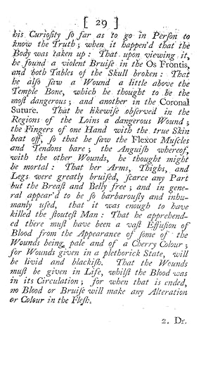Details of Dr Salmon’s examination of the body are given, detailing the wounds and injuries, and testimony of abuse by Henry Butler, an ex-servant involving forced excrement-eating.