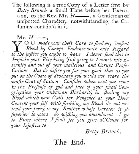 Lastly, a copy of a letter sent by Miss Betty branch some small time before her execution, to the Rev. Mr. H- of Hemmington