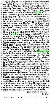 On Friday last two Highwaymen were brought to our Castle Gaol, for an Attempt to robb two Country Men. The Story is very remarkable; they set upon two Countrymen in Whitney, (within seven miles of this City), And the Highwaymen being well Arm’d, but the Countrymen naked of Weapons; the latter quietly deliver’d their Monies what little they had : They unsatiable Wretches not satisfy’d with they poor Country Men’s money, resolv’d to stript them, and take away their Cloths, and also to take their Horses. They Countrymen being very unwilling to be stript ; Expostulated first with them, and beg’d them to let them alone, and not stript them ; but this making them more Cruel and Eager ; they honest Men boldly engag’d them, tho Naked and Unarm’d ; and, as Providence order’d it, both the Rogues Pistols, for both of them endeavour’d to Shoot, mis’d Fire : In that very Juncture another Traveller came up to them by meer Chance upon the Road ; this encouraged the honest Men so much, that they laid about them Furiously, and one of the Highwaymen going to stab one of them with a Bayonette, they Countryman put it by, and closing with him, the Highwayman in the Scuffle wounded himself very sorely in the Thigh : In short, this so encouraged the Country Men, that after a long Engagement they Master’d they Thieves, took them both, and brought them to Oxford, where they were carried before the Vice-Chancellor, and by him committed to the Castle. Upon examination they prove to be two Dragoons of ——- Regiment, from which they both Deserted some time ago. it is said that several other People come in against them for other Robberies, so that there are several Indictments likely to be brought against them ; and which is better than all the rest, the two honest Countrymen, instead of being Robbed, are like to get 40l. a piece by Act of Parliament, for apprehending Highwaymen.