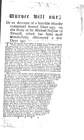 My search terms in the Eighteenth Century Collections Online have basically been things like “horrid murder” and “horrible murder” to see what I can get, and this popped up in an Edinburgh publication: MURDER WILL OUT, Or an Account of a horrible Murder committed several Years ago, on the Body of Sir Michael Balfour of Denmill which has been most wonderfully discovered a few Days ago.