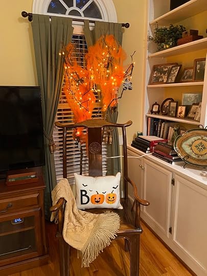 Back home, I celebrate the October fall holiday, Halloween, with a few decorations I pull out of the attic each year. A tree limb I once picked up in the yard is adorned with that orange stretchable spider-web stuff and lit with a strand of orange lights. My husband and I plug up the Halloween “tree” every night while we watch TV or read.