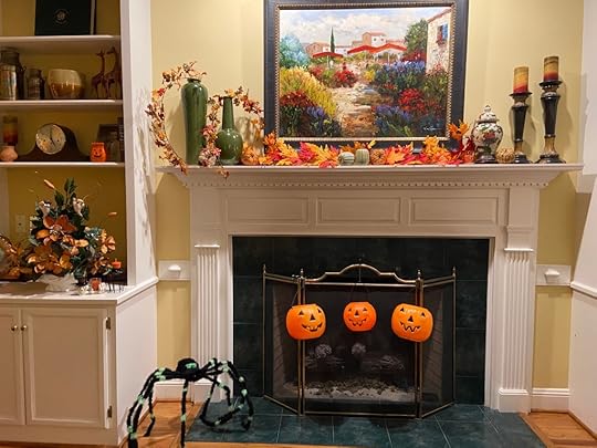 The fireplace mantel gets a dose of easy fall decorating, too. After Halloween, I’ll remove spooky items and leave the fake fall foliage up through Thanksgiving. Yes, my living room might be a little tacky for some tastes, but I like to think it’s cheerful.