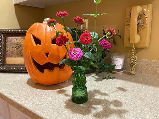 Speaking of cheerful, zinnias are the flowers that keep producing long after other summer bloomers are gone. I picked this arrangement yesterday, and there are more where these came from. (The harvest-gold phone is no longer connected, in case you’re wondering. The grandchildren have enjoyed playing with it over the years.)