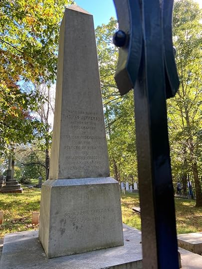 We stood outside the Jefferson gated cemetery, where the largest tomb was of course Jefferson’s. Prior to his death, he left specific instructions concerning the obelisk he wanted over his grave. Surprisingly, the three accomplishments engraved do not include his presidency.