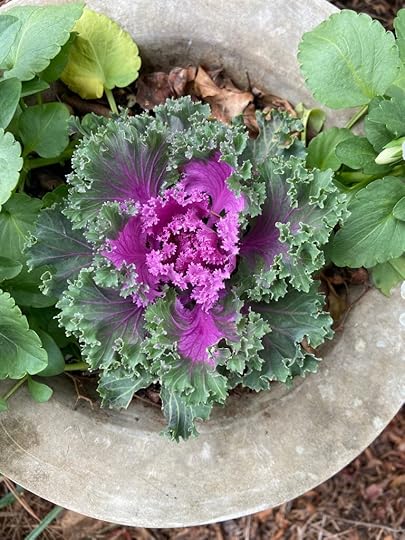 In other fall news, the squirrels–or maybe rabbits?–are at it again: gnawing on my plants. I set out several ornamental cabbages a couple of weeks ago. Some are flourishing; others have been attacked. Arrgggh! I read somewhere that used coffee grounds and bone meal deter critters, so I’ve used both around my plants.