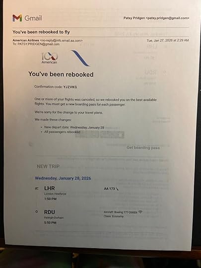 An ice storm in the States resulted in canceled flights, including one we’d scheduled to get to Raleigh-Durham Airport after three nights in London. Oh well, we decided, if we have to be stuck somewhere for an extra day, London is a good place. We had a couple of bad moments, though, when the hotel we’d been staying in for three nights was unavailable for a fourth. Really? I pictured myself homeless or sleeping at the airport.