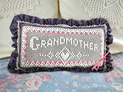The iron bed is from the attic of the farmhouse my husband grew up in. Wedding photos of Clabe and Leora Wilson are in oval frames on the corner. Grandma Neal crocheted the doily under the ginger jar lamp. I made the small pillow, with GRANDMOTHER crocheting on it.Even though Grandma Ruby Neal and her daughters quilted since the Dark Ages, I never tried it even though I did a lot of sewing, especially after joining 4-H. Mom sewed but she didn’t quilt.