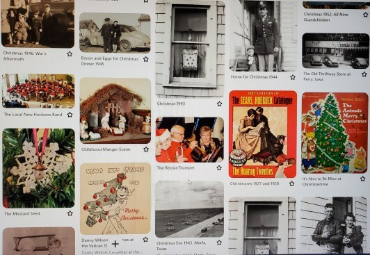A few of the pins on the Christmas boardI tried it and it’s become very handy. Pinterest allows so many more categories (called “boards”) than this website does. Besides a WWII category, I’ve created “boards” for each Wilson brother, for each plane one of them flew, each ship one of them was assigned to. It’s visual and is the handiest place to find older stories.
