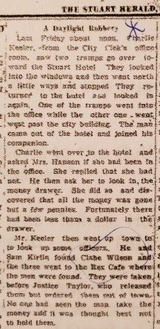 Last Friday about noon, Charlie Keeler from the City Clerk’s office room, saw two tramps go over toward the Stuart Hotel. They looked into the windows and then went north a little ways and stopped. They returned to the hotel and looked in again. One of the tramps went into the office while the other one went west past the city building. The man came out of the hotel and joined his companion.