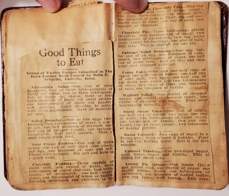 In Leora’s little Memorandum book, dated March 31st, 1915, she wrote and pasted recipes. One is for cabbage salad dressing.