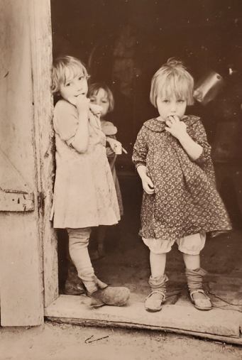 “SMITHLAND VICINITY “December 1936. The children of Earl Pauley in their home on submarginal farmland. Russell Lee.” Russell Lee was a photographer for Farm Security. From “Unknown Iowa: Farm Security Photos 1936-1941” by John M. Zielinski. I had to look up Smithland, Iowa. It’s in Woodbury County, near Sioux City.