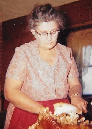Grandma Ruby Neal wearing festive earrings and apron, and working on a turkey, rural Dexter, IowaGrandmothers always used to wear aprons; they were a matter of necessity. An apron was made from an arm’s length of material, hemmed and gathered at the waist with a band and ties. Most were checks or prints because they didn’t show soil as easy. Some were fancy with cross-stitch or embroidery.