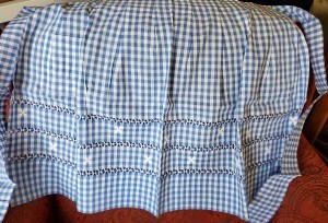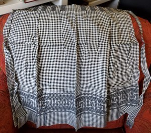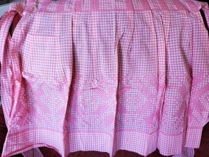 These aprons were easier to wash than a dress and could be changed in a moment’s notice. When a visitor was seen coming, it was quickly removed. the apron hastily dusted the table and polished the silver. It was used to cover the head and take the chill from the shoulders. Carrying wash water to the house and out again, the apron invariably fell in the pail of water a few times. At canning time the corner was used to hold the jar while screwing on the zinc lid.