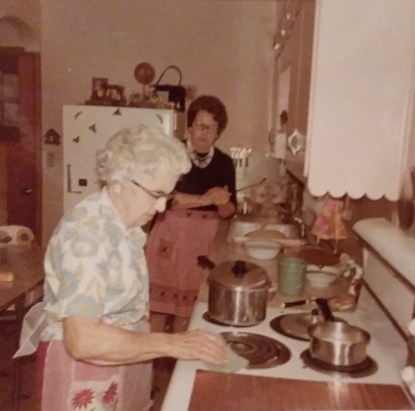 Leora Wilson and daughter Doris Neal, wearing one of Ruby Neal’s creative aprons, Guthrie Center, 1970s.