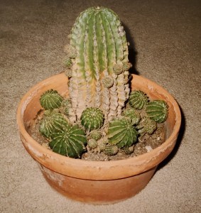 Once a salesman came to the back door. He noticed a large cactus in a clay pot on the patio. Taller than it was round, it had a flock of little prickly bumps clinging to it, especially around its base. It reminded you of a mother hen with its chicks.