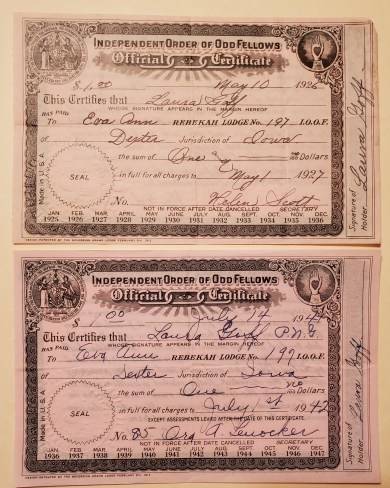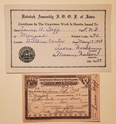Earliest membership card Laura saved was when Goffs lived at Dexter. She paid $1.00 dues to the Eva Ann Rebekah Lodge No. 197 I.O.O.F of Dexter Jurisdiction of Iowa on May 10, 1926. Good until May 1, 1927.
