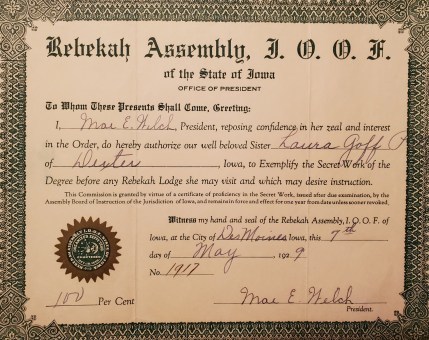 The Daughters of Rebekah, also known as the Rebekahs and the International Association of Rebekah Assemblies, is an international service-oriented organization and a branch of the Independent Order of Odd Fellows. Laura’s husband “Sherd” Goff was a member of the I.O.O.F.Symbol: Three-link chain, dove, lily, moon and seven stars