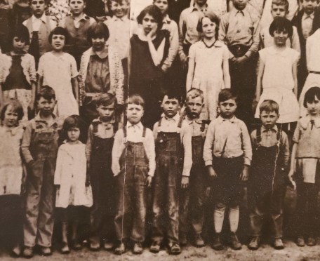 Dexter School, 1930. Cousins Danny Wilson and Merrill Goff are center front. Darlene Wilson is second from the left in the second row, with Maxine Goff at the end of the same row.One day Maxine came to the Wilsons’ kitchen door in tears. “What’s wrong, Maxine?” Leora could see that her niece had mighty short hair.