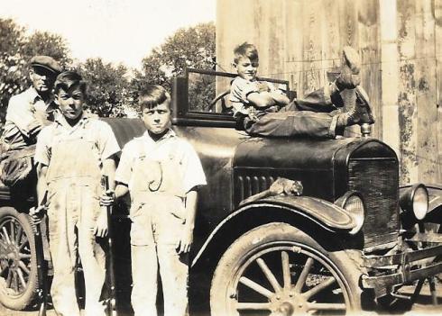 Clabe, Dale, Danny, and Junior with the “roadster.” Their pet squirrel Rusty is on the fender.
