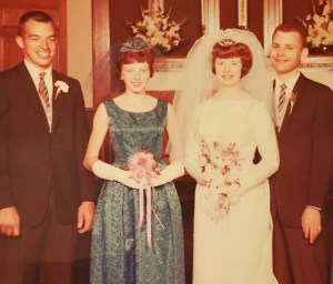 John and Judy Schild, Joy and Guy Kidney, 1966According to their website, a Quilt of Valor® (QOV) is a quality, handmade quilt that is machine or hand quilted. It is awarded to a Service Member or Veteran who has been touched by war. The Quilt says unequivocally, “Thank you for your service and sacrifice in serving our nation.”