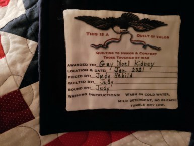 Judy Schild was my roommate in college. Guy and I were in Judy and John Schild’s wedding, and they were in ours about six months later. Judy has quilted for years but I didn’t realize she is also a representative for the Quilts of Valor Foundation.