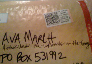In case you can't read it in the pic, the package is addressed to 'Ava March, Author-Under-the-Cupboards-in-the-Garage'. I seriously laughed out loud (and got a few odd looks from the postal workers). Many thanks to Chris for the gift, and for making my day. ((hugs))Back to your regularly scheduled post. I tend to be rather type-A in everyday life, so of course I keep a writing schedule where I plan what I want to write for the year and track what I actually got done. For 2010, here's what got done:- From Afar (novella) - wrote in 2009, released 2/2010