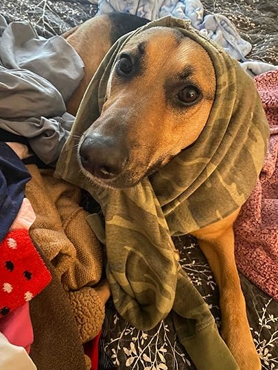 (Molly buried in fresh from the dryer clothes on laundry day!)