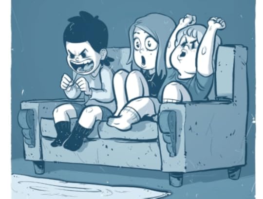 The loved the illustrations in this graphic novel so much, I just cannot not give it a full five stars! “Secret Passages” is a surreal non-linear memoir by Axelle Lenoir, where she directly appears as an adult artist through the pages to address readers as she takes us through what life was like for her as a six-year-old girl. We then meet the three siblings, little rebellious Axelle, her older brother David and the youngest Tonio who as an imaginary monster friend.