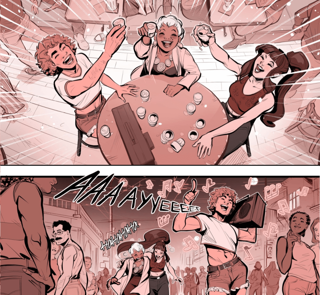 The mood of the comic, just like the previous issues, continues to be chirpy and bright. The peachy tones of the panels adds a warm charm to everything, even the smutty bits. And then there is Alice – Iolanda & Elisa have created such an adorable protagonist, that no matter who appears in the story, most readers will always be ‘Team Alice’. In this issue, they redeem Robin’s character (the hot friend Alice has a crush on) by offsetting some of her mean traits. One just wishes there would’ve been more scenes of the foxy flatmates, they seem like the kind of folks you’d love to have a few drinks with.