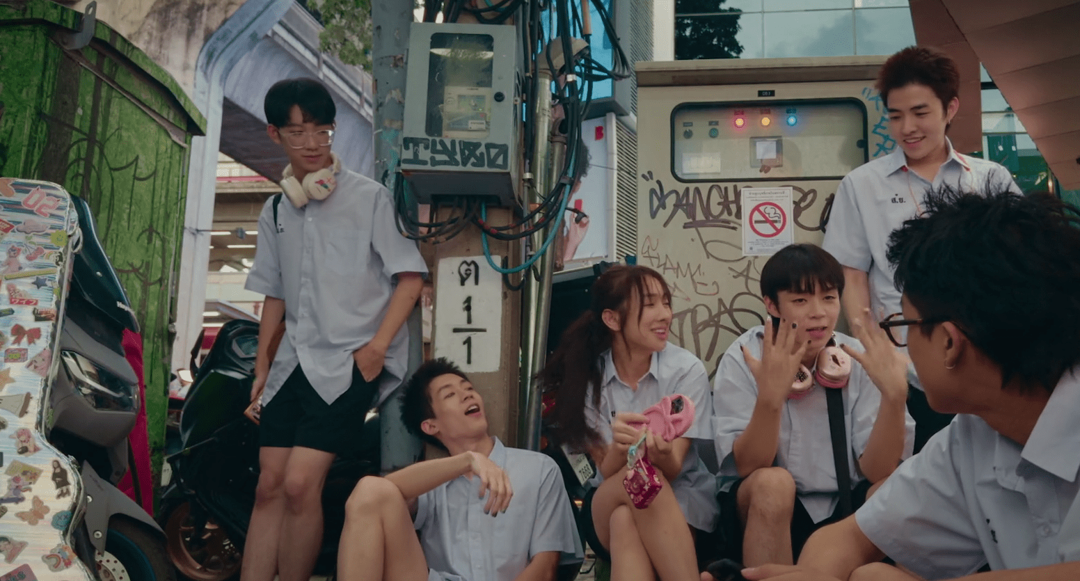 The background music is fantastic, incorporating a lot of synth-pop beats that give the show a lightly nostalgic feel mixed with vibrant modern tones. It also features a range of popular Thai-pop songs and even a few fleeting moments of K-pop hits, including tracks by BTS and BLACKPINK – two of the biggest boy and girl bands in the world. Music is also a huge mode of bonding between the characters, with a hilarious little sub-plot about some of them sharing exclusive curated playlists online, with more songs shared implying stronger mutual interest.