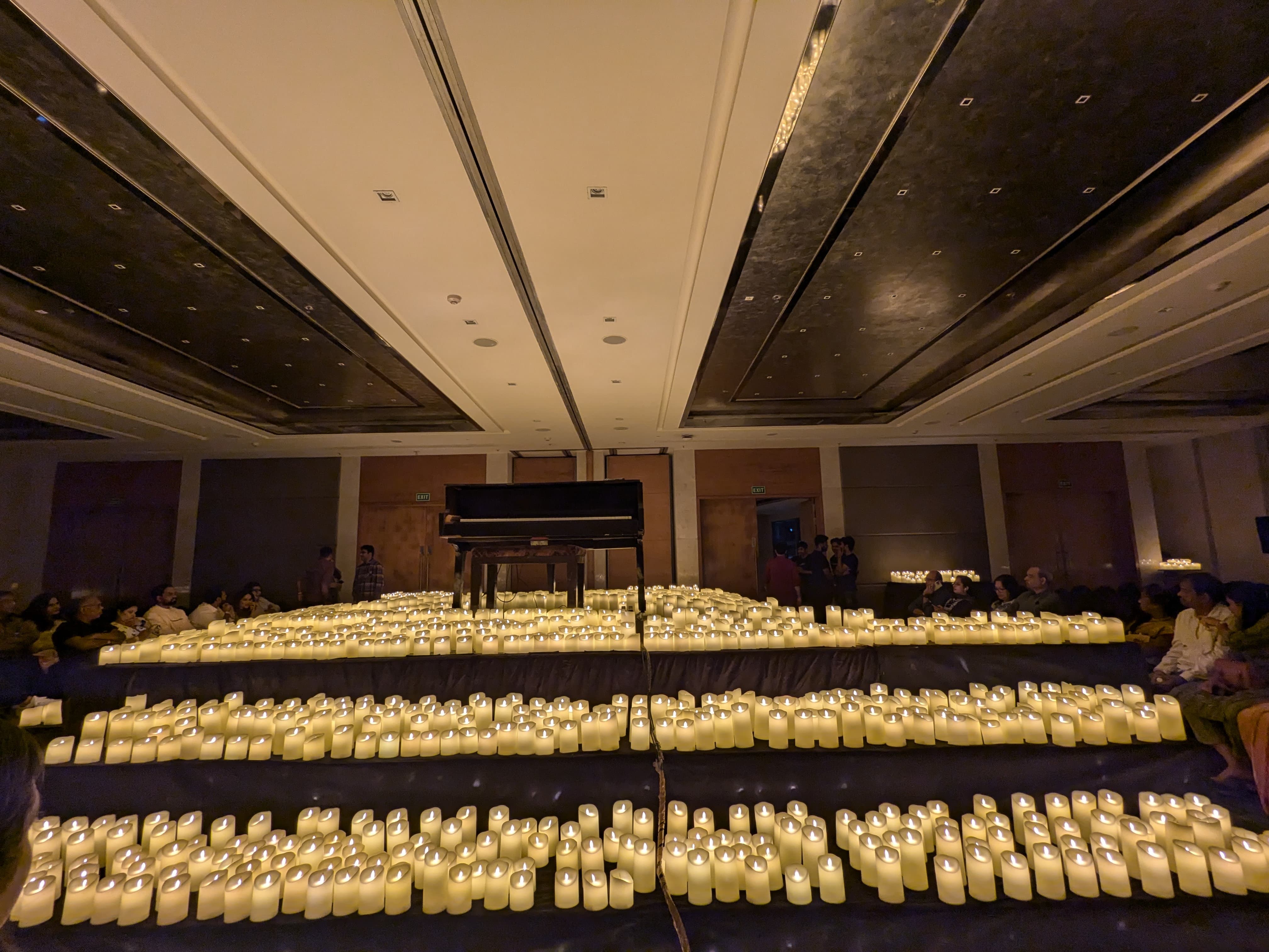 Saturday night, when we reached the venue, Fairfield by Marriott, there were beautiful candles everywhere, and of-course they were fake – electric lamps. Which we obviously knew, no venue in their right mind would allow hundreds or thousands of real candles at a concert. “It’s a fire hazard to have real candles,” I told mom. We got our entry bands on our hands and entered the primary hall where the concert was going to take place. A brown grand piano which had evidently experienced much wear and tear stood at the center of the air-conditioned hall, surrounded by candles. The venue looked beautiful, and the candles seemed like the real deal from afar, just like the pictures.