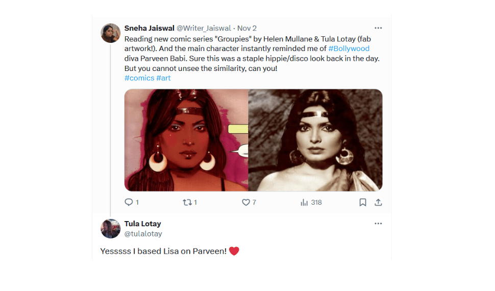At the cost of sounding repetitive (sorry, but I can’t help it) — Tula Lotay’s art in Groupies is a sight worth beholding. She draws the women like dreamy sirens from a fantasy fiction book, yet, from their outfits, you know it’s the ’60s/’70s. I already mentioned in the previous issue’s review how Lisa’s character design looked inspired by Bollywood diva Parveen Babi, a very popular actor during the ’70s. And interestingly, Tula Lotay confirmed to me in a tweet response that Parveen Babi was indeed the inspiration for the character. The looks scream 70s glam.