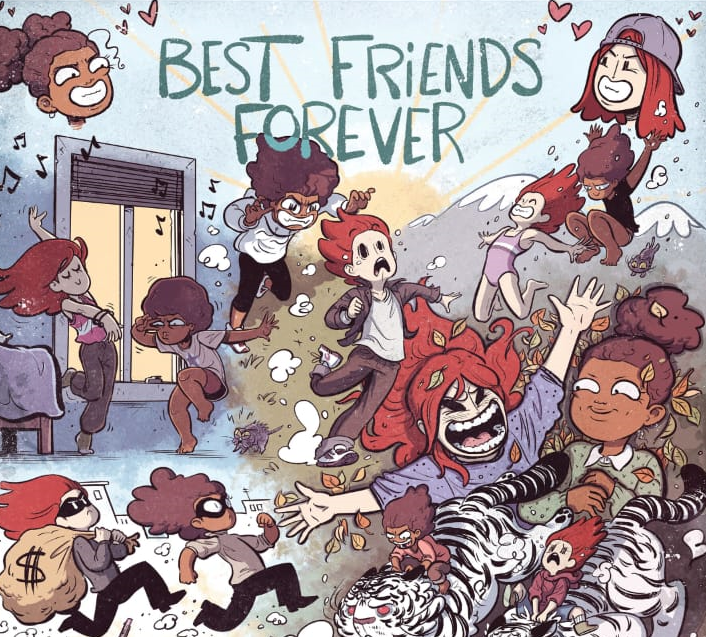 Axelle Lenoir also throws in some really cute flashbacks of the girls growing up, including how they met for the first time as tiny kids. From playing princesses, robbing banks, and riding tigers, Nathalie and Marie create a limitless number of worlds for themselves. And while these games help the teen protagonist to happily escape their more mundane realities, in a surprising turn of events, towards the second half of the book, the girls discuss some serious, real-world emotions too.