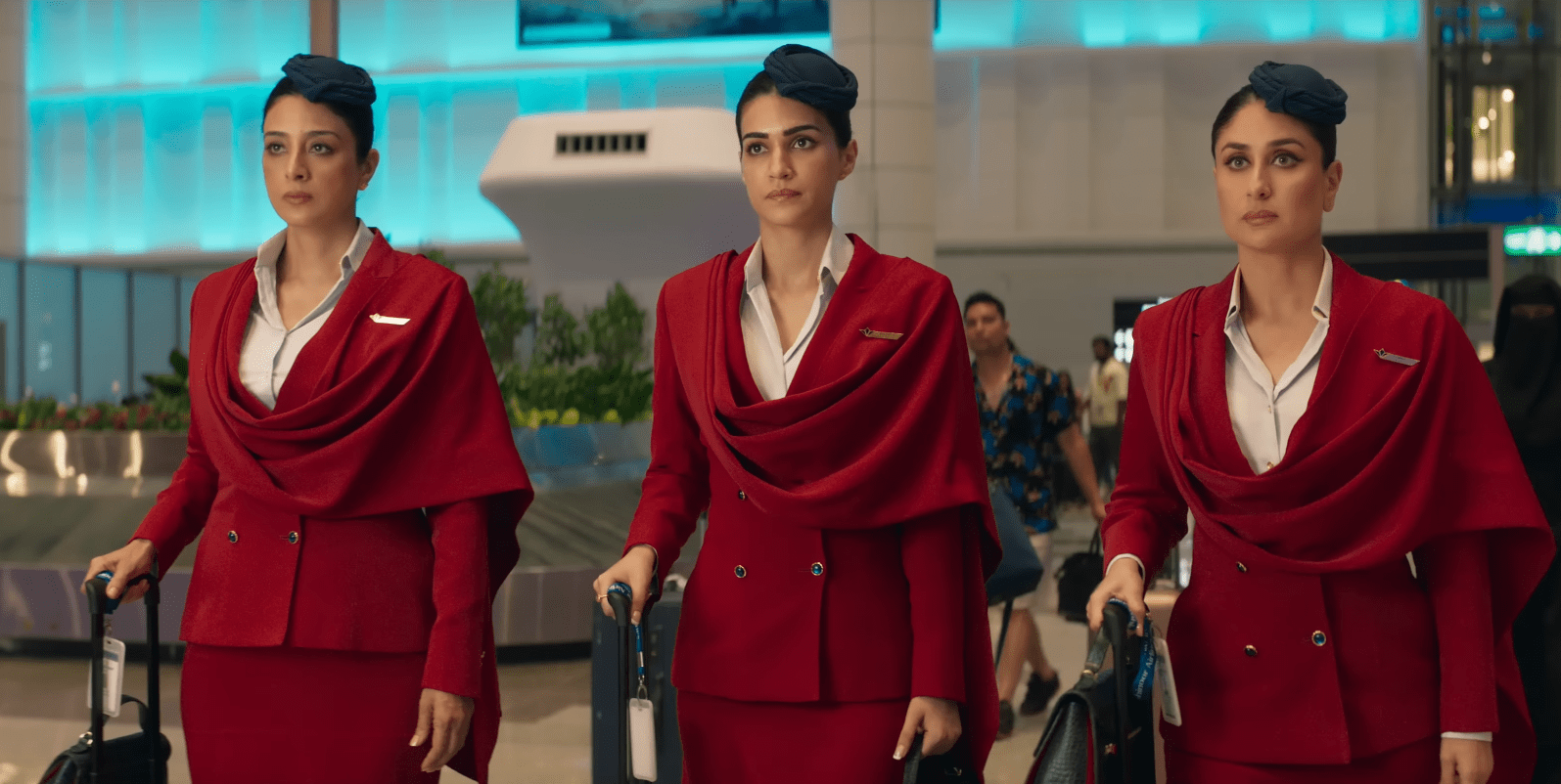 Directed by Rajesh A Krishnan, the 2024 movie “Crew,” starring Kareena Kapoor, Kriti Sanon, and Tabu, has been written by Nidhi Mehra and Mehul Suri, the duo who co-wrote the buddy comedy “Veere Di Wedding.” As soon as the movie begins, the comical drama sets the tone for its primary conflict as Geeta (Tabu), Divya (Kriti Sanon), and Jasmine (Kareena Kapoor) are summoned for questioning over gold smuggling. The characters quickly introduce themselves, each one a world apart from the others.
