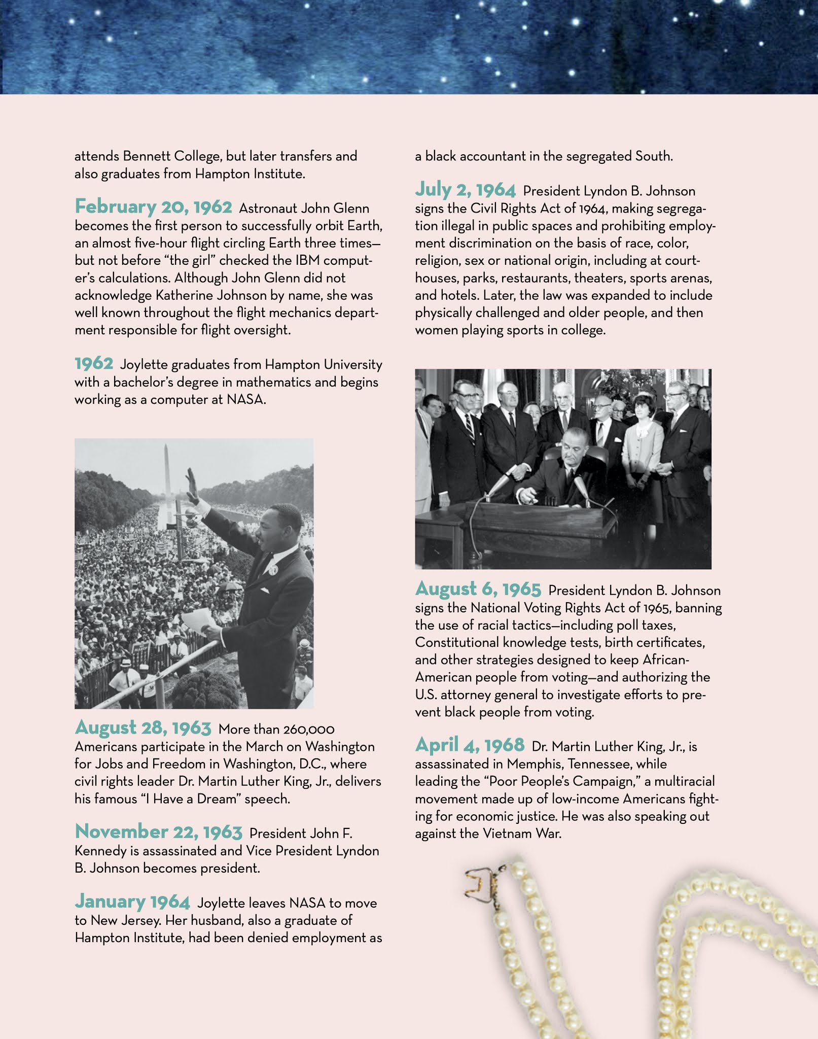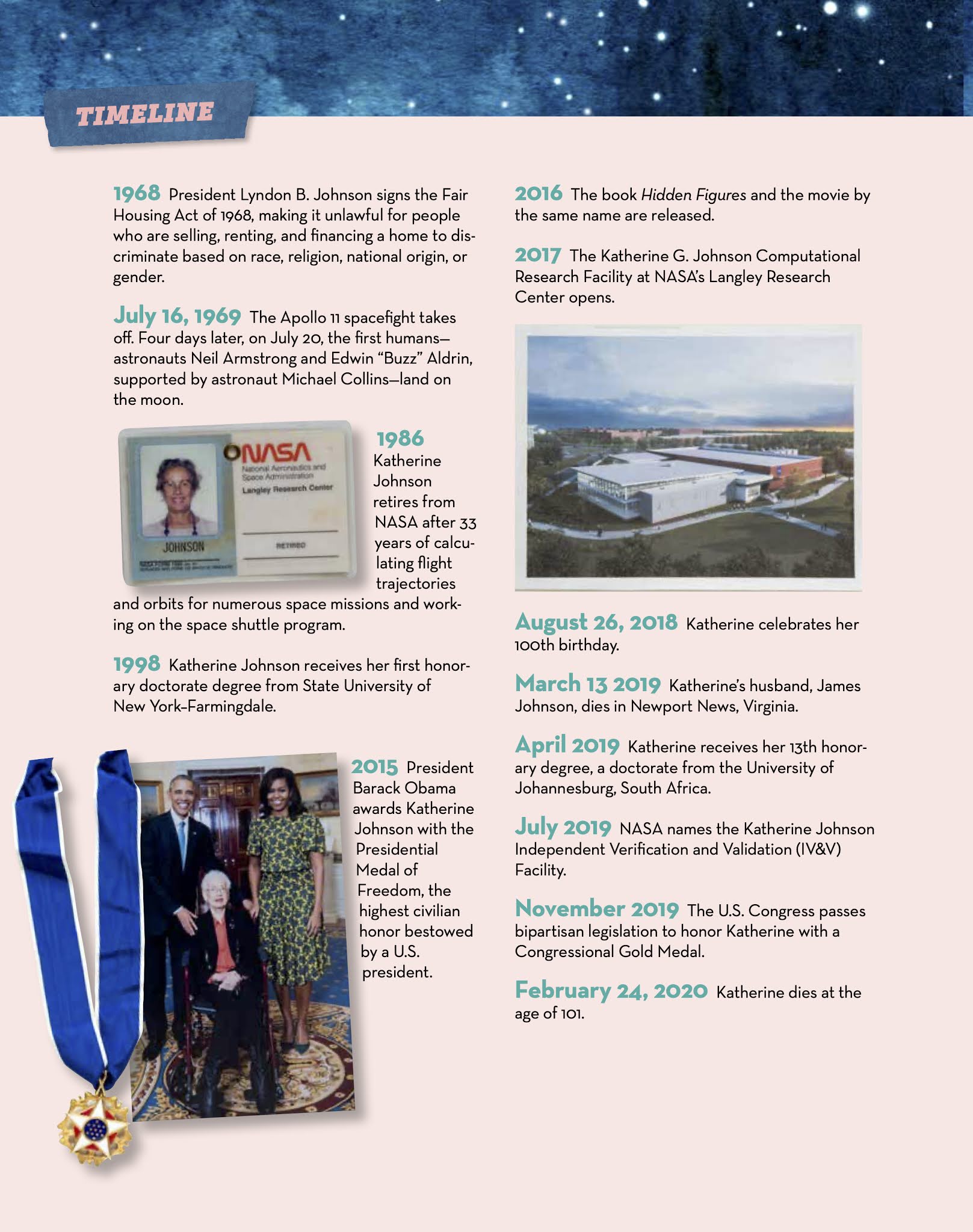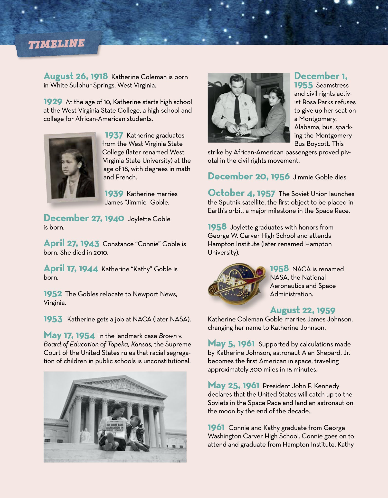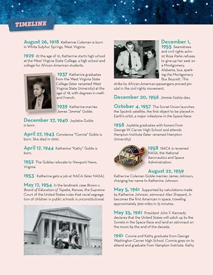 In Praise of One Step Further“Engaging, collage-style art augments the text, with speech bubbles, archival family photographs, and Barlow’s child-friendly illustrations. Concurrently accessible and intimate, this book will both inform readers and inspire them to reach for the stars.” ―Publishers Weekly “A concise, engaging story of a Black family in the South during the Civil Rights era.” ―Booklist “The blend of Johnson’s and her daughters’ voices is intimate and inspiring.” ―Horn Book The Life of a LegendThis timeline was so informative to me! I was also very happy to see that Katherine briefly attended my HSBU Bennett College as well!