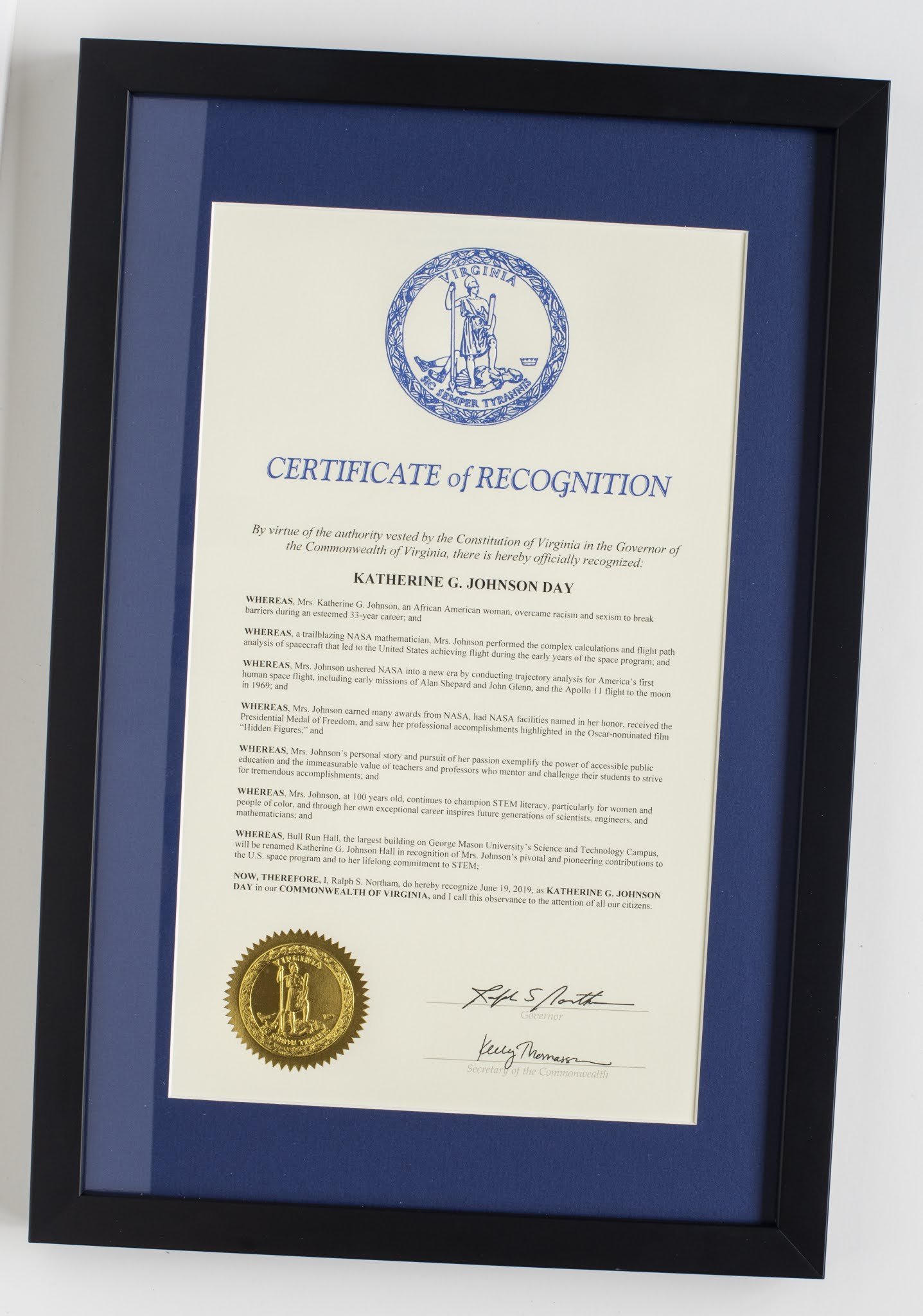 Katherine’s Certificate of Recognition declaring June 19, 2019 as Katherine G. Johnson Day in Virginia*****