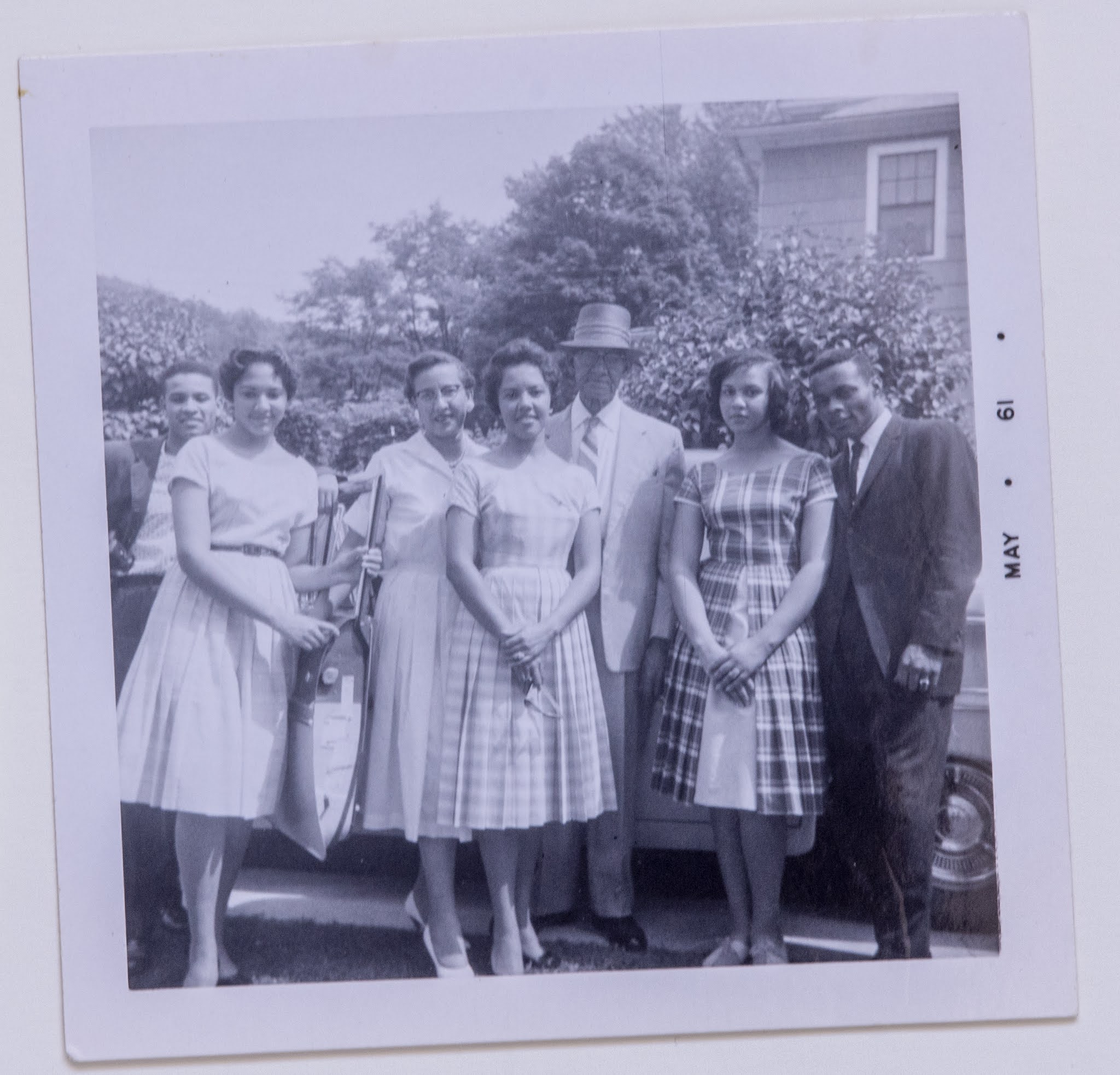 (L to R) Unidentified man, Kathy, Katherine, Joylette, Katherine’s father Joshua, Connie, Unidentified man in 1961