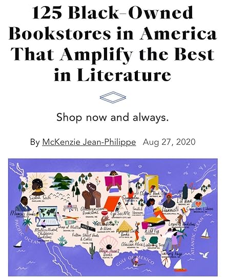 Image: A screenshot of an article by McKenzie Jean-Philippe that headline reads “125 Black-Owned Bookstores in America That Amplify the Best in Literature” with a graphic of a map of the United StatesSheRoes and Queens Among UsStacey Abrams