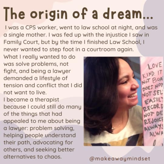 I was a CPS worker, went to law school at night, and was a single mother. I was fed up with the injustice I saw in Family Court, but by the time I finished Law School, I wanted nothing more to do with Family Court. What I really wanted to do was solve problems, not fight, and being a lawyer demanded a lifestyle of tension and conflict that I did not want to live.