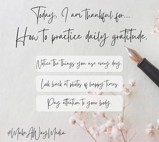 Pay attention to the things you use every day, like the glasses on your face or the tap water you turn on over and over. When you notice these things, acknowledge your gratitude for them.Look back at old photos of vacations or family celebrations. Remember these times and the opportunities they presented. Feel grateful. Take time to stretch your body and notice each part, especially the ones that don’t hurt or the ones you don’t even notice you have until they begin to hurt. Give thanks for these.The post Make A Way: Staying Grateful all Year appeared first on Make A Way Media.