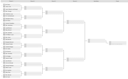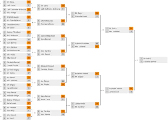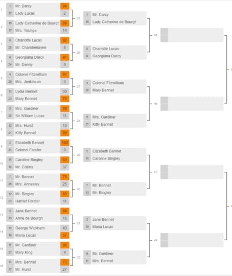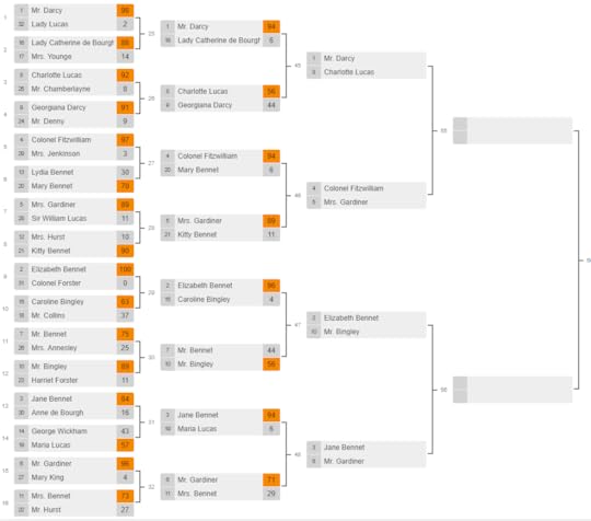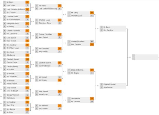 All joking aside, we have a final four! Mr. Darcy, Mrs. Gardiner, Elizabeth Bennet, and Jane Bennet have defeated their opponents to become the last four standing. The only really close race was Mrs. Gardiner, who beat Colonel Fitzwilliam by a mere 52% to his 48%. There may have been some voter fraud there, may need to demand a recount. Ha ha.