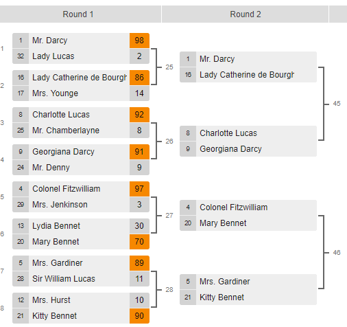 We had some close calls in the second half of round #2! Maria Lucas only edged out George Wickham 57 to 43! And voters picked Caroline Bingley over Mr. Collins by 63 to 37.
