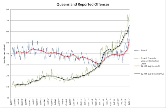 Queensland experienced the largest number of assaults ever in August 2021 according to data published by the Queensland Police. Last month there were almost 4,000 assaults in the State. This is double the number which occurred in August 2019. Similarly there were 37% more breaches of domestic violence orders in August 2021 when compared with August 2019. Blowouts like this do not happen in crime statistics. A bad year is a 10% increase. Something very, very odd is happening and the science says that COVID could be the culprit.