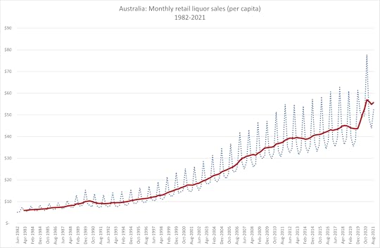 Commonwealth Bank card spending data tells us that Australians spent between 30 and 45% more on alcohol in 2021 than they did in the same months in 2019.
