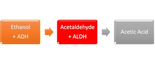 The ADH oxidizes ethanol into acetaldehyde, a Class 1 Carcinogen. At first glance this is not the smartest thing to do. Acetaldehyde is up to 30 times more toxic than ethanol. But we do it to buy time. The body diffuses an acutely toxic substance, ethanol, by turning it into a substance which while more toxic, takes longer to do harm. All being well, we use that extra time to oxidise the acetaldehyde to relatively harmless acetic acid (the primary ingredient in vinegar). We do that using ALDH (Acetaldehyde dehydrogenase) enzymes.