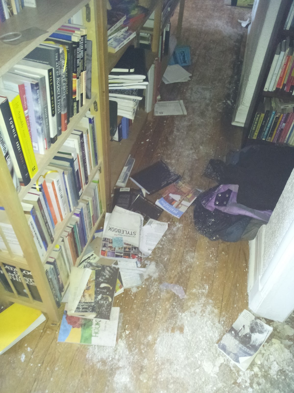 We had nine bookcases in the hallway. Only a few books fully trashed. Points for picking out the CanLit titles.